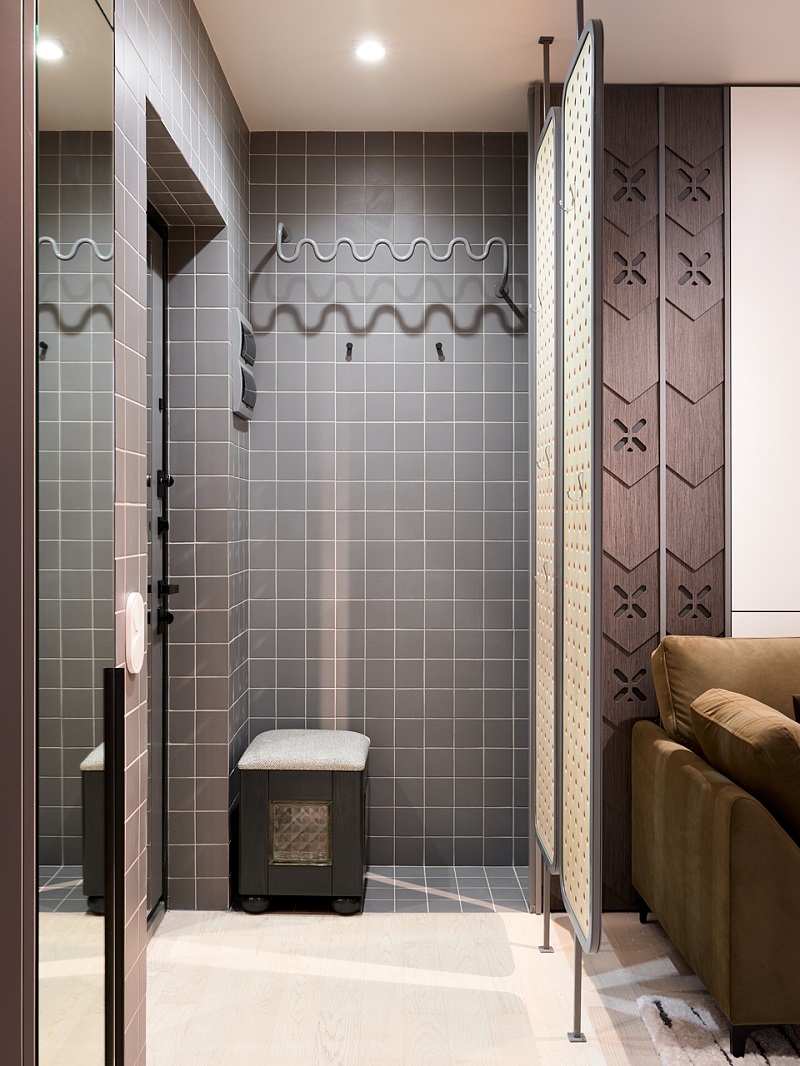 Чтобы прихожая не сливалась с гостиной, её отделили лёгкой перегородкой. Здесь разместили и открытую вешалку для верхней одежды, и зону для обуви, и закрытый шкаф. Дополнительно обустроили кладовую с местом для стиральной машины, гладильной доски и бытовых мелочей.