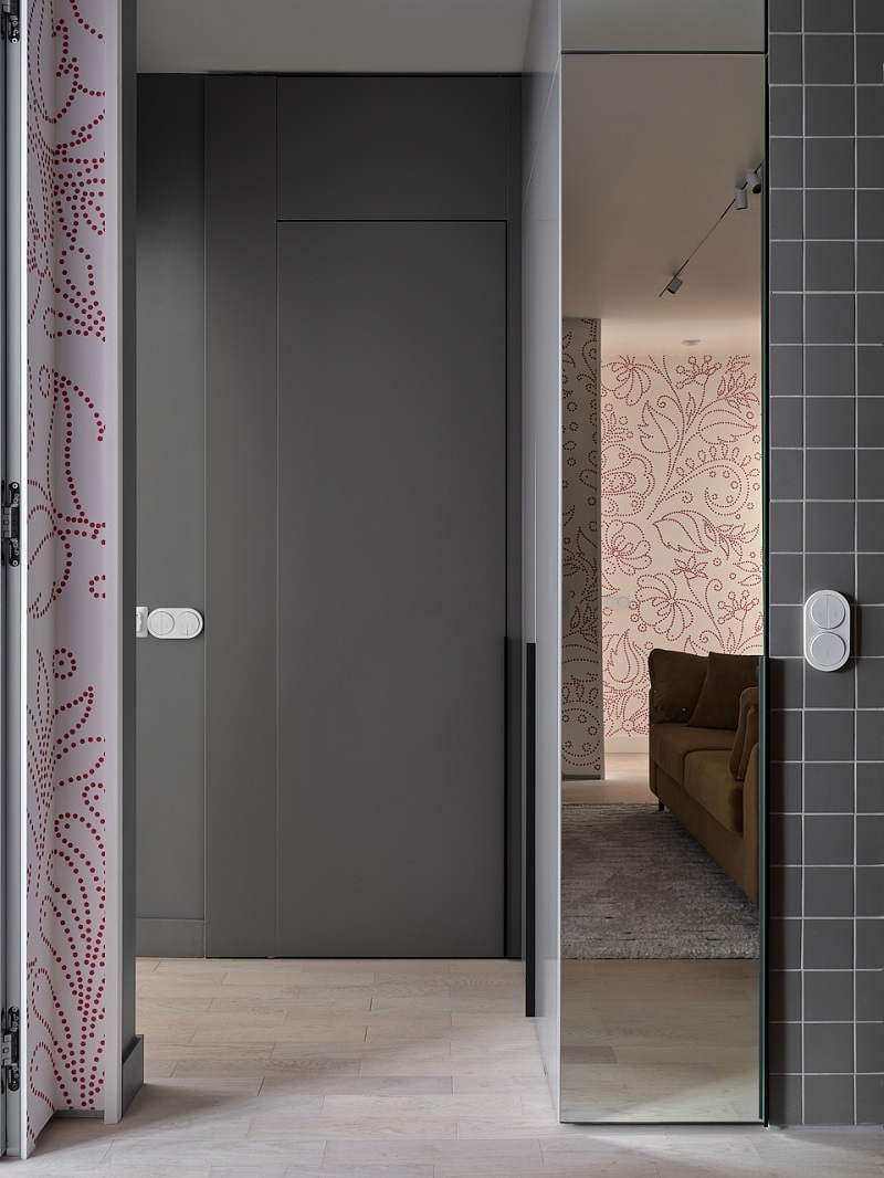 В гостиной потолок и часть стены оформили в белом цвете, а дверь со стороны спальни покрасили в тон гардеробной. Хозяйственная зона и коридор выполнены в респектабельном сером, гармонирующем с плиткой.